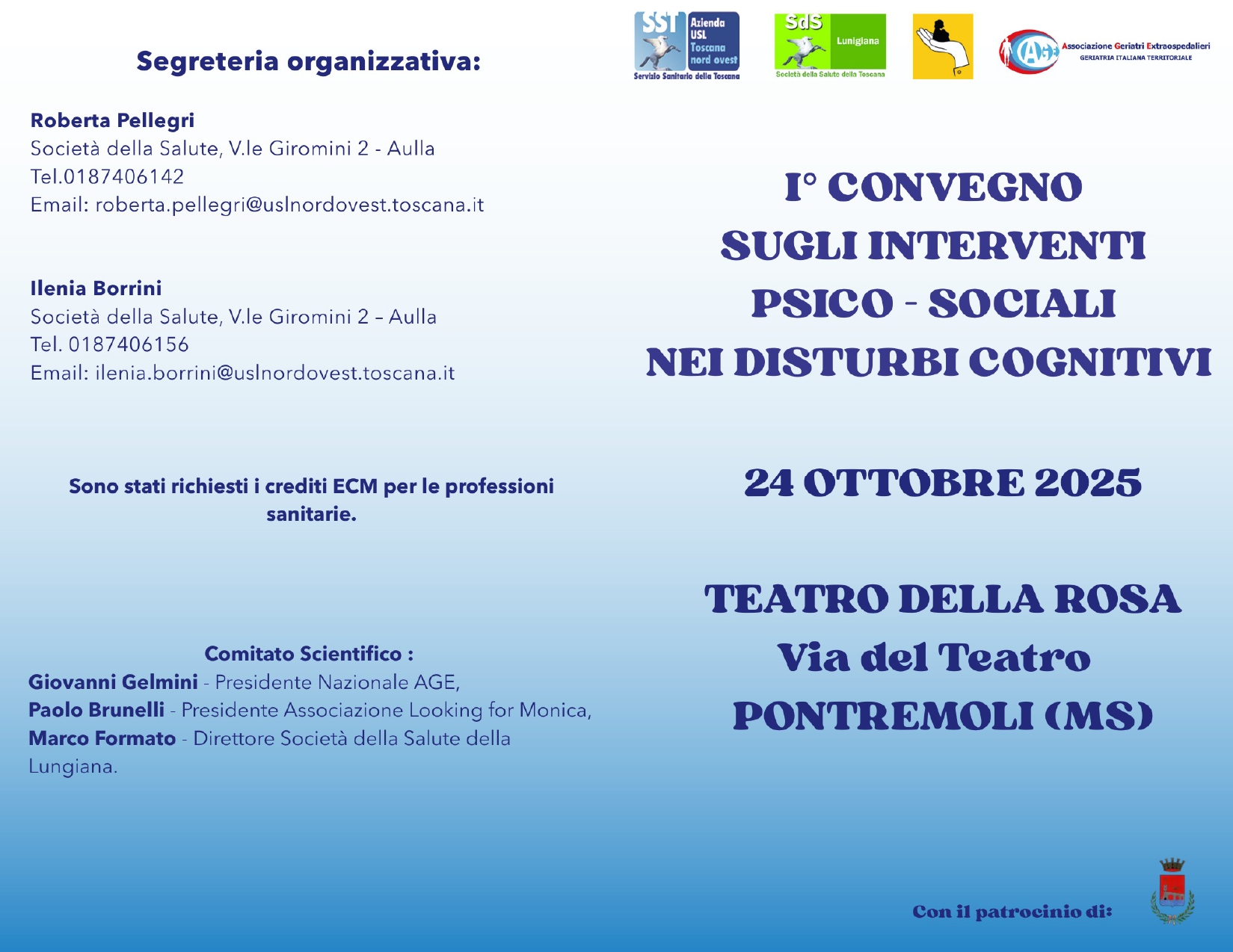 Venerdì 24 ottobre, al Teatro della Rosa di Pontremoli, ci sarà il primo convegno sugli interventi psico-sociali nei disturbi cognitivi. Sarà un’ottima occasione per conoscere le problematiche legate alle demenze, gli interventi più utili per persone affette da Alzheimer e i servizi presenti sul territorio. Si comincerà alle 8,30 con l’iscrizione dei partecipanti, alle 9,15 [...]