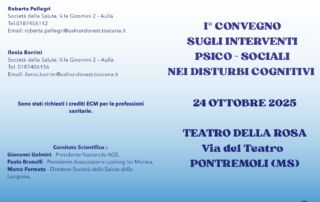 Venerdì 24 ottobre, al Teatro della Rosa di Pontremoli, ci sarà il primo convegno sugli interventi psico-sociali nei disturbi cognitivi. Sarà un’ottima occasione per conoscere le problematiche legate alle demenze, gli interventi più utili per [...]