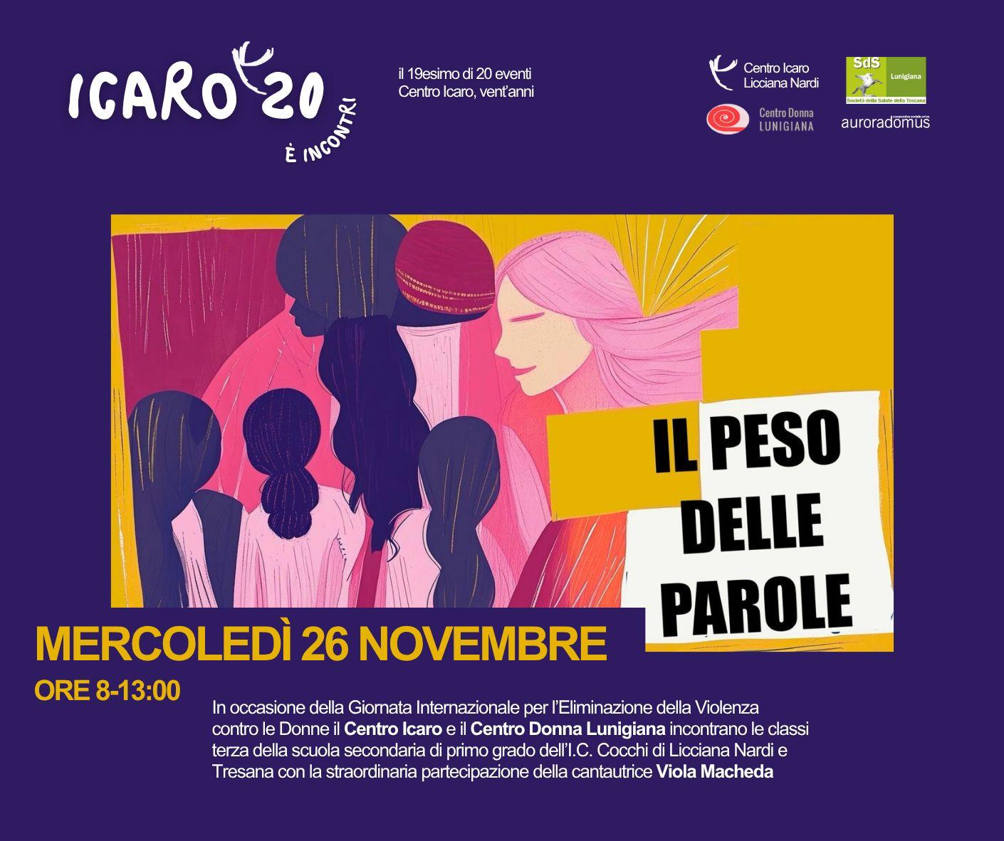 Martedì 24 novembre alle 16,30, la Società della salute e il Consultorio, con il patrocinio del Comune di Aulla, organizzeranno un incontro nella Sala Giuliani della biblioteca, intitolato ‘Le parole sono importanti, dalla conoscenza dei dati alla riflessione condivisa: socialità, relazioni e affettività con strumenti di prevenzione della violenza’. L’iniziativa vuole essere un’occasione per approfondire i dati sulla violenza, ma anche per riscoprire il valore delle relazioni, della socialità e dell’affettività come strumenti di prevenzione e di speranza. Al termine dell’incontro una merenda condivisa, un gesto semplice ma significativo per rafforzare il senso di solidarietà. Sempre quel giorno sarà pubblicato un video, un flash mob, sui canali social della Sds, realizzato dai ragazzi della Bottega della salute: nel video sindaci e amministratori donna della Lunigiana presteranno il proprio volto per sensibilizzare le persone sul tema. Un altro evento è fissato per mercoledì 25 novembre, con la sinergia tra Centro Icaro e Centro Donna. Quest’anno, in occasione dei ‘Venti eventi’, il pensiero è stato rivolto alle nuove generazioni con un format inconsueto, che prevede la partecipazione di una cantante del territorio conosciuta dai giovani, Viola Macheda. Il tema sarà: come il linguaggio che perpetua stereotipi di genere porti alla violenza. Attraverso testi di canzoni e altri esempi di frasi purtroppo frequenti e apparentemente innocue, si ragionerà coi ragazzi delle classi terze del comprensivo Cocchi di Licciana Nardi e Tresana, sui significati e le conseguenze dell’utilizzo di espressioni sessiste e discriminatorie, che spesso normalizzano la violenza. La partecipazione della cantante, che ha scritto un brano sulla violenza di genere ‘Dimmi perchè’ impreziosisce l’incontro, con un contributo artistico e umano di valore e gratuito.